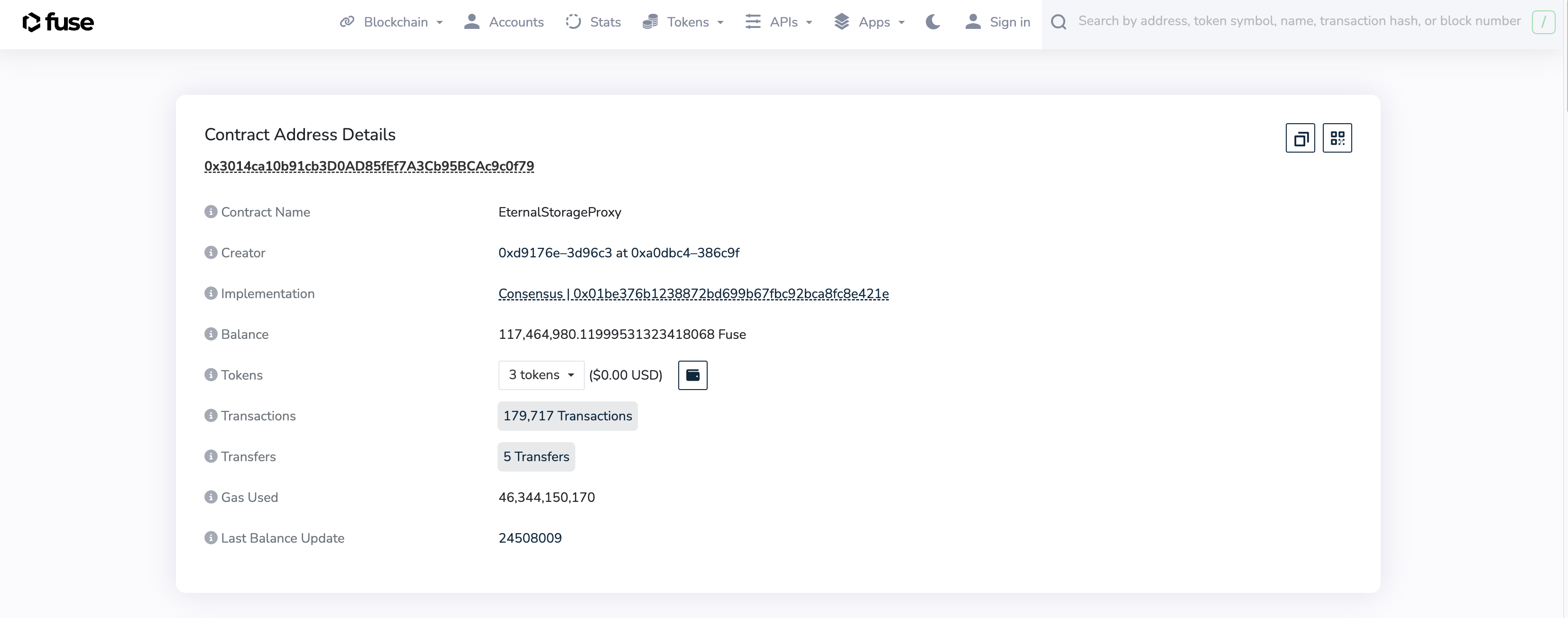 - Navigate to the staking consensus contract on Fuse Explorer: https://explorer.fuse.io/address/0x3014ca10b91cb3D0AD85fEf7A3Cb95BCAc9c0f79