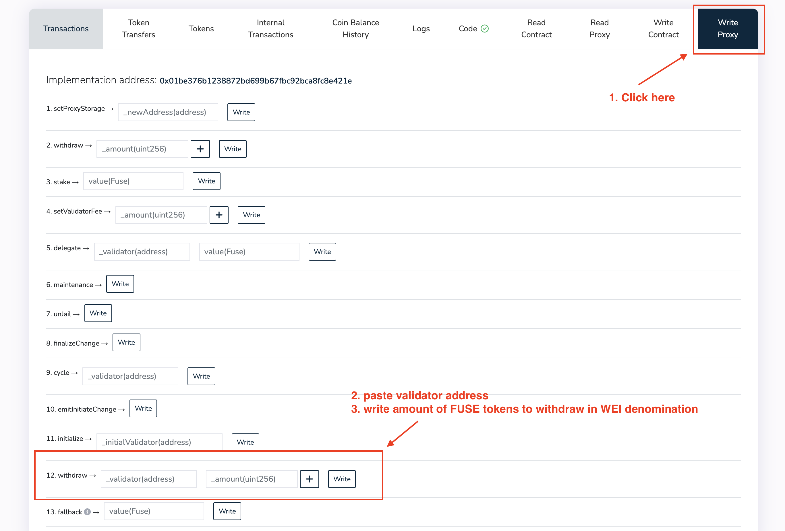 - Scroll down to section ‘12. Withdraw’, paste the validator address and the amount of FUSE to withdraw in WEI denomination.